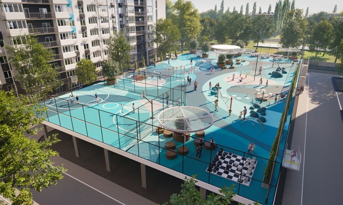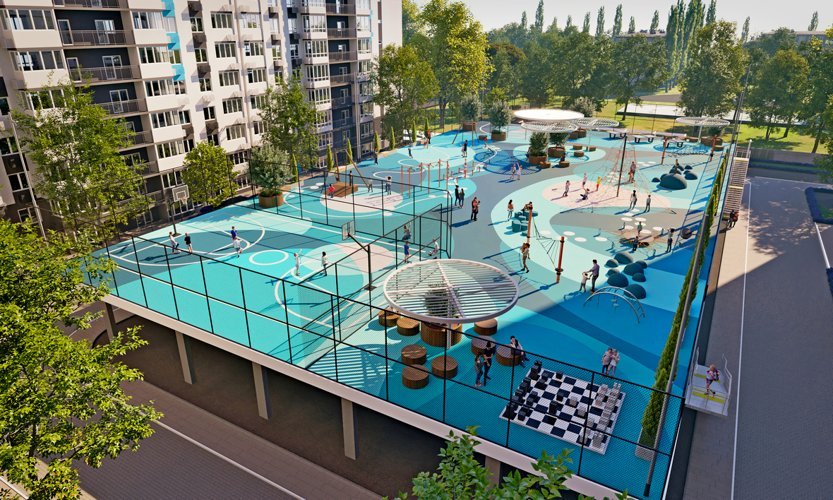 Двор формата активити парк с тренажерами и стадионами. Места для командного спорта, Площадки с инклюзивным оборудованием, Места для отдыха.