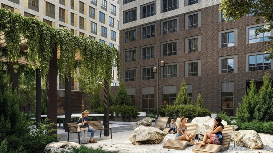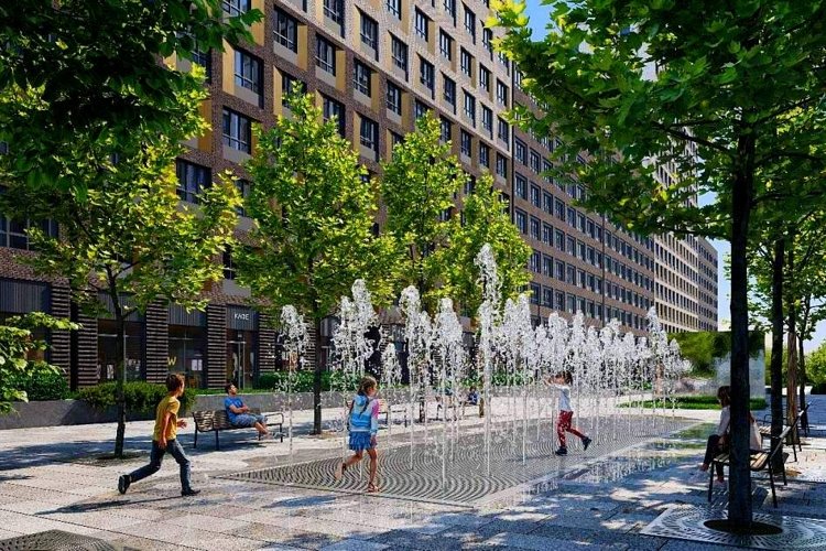 Зеленый двор с детскими площадками, физкультурно-оздоровительным комплексом, спортхабом и прогулочным бульваром